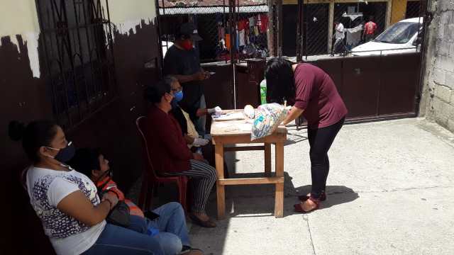 In June, the Sister Parish committee in Tierra Nueva 2, Guatemala organized a second round of food aid. For the first round, they focused on providing food baskets and basic hygiene supplies to elders and single mothers, those thought to be among the most vulnerable to the negative economic impact of the shelter-at-home orders. For the second round, the committee handed out food aid and basic supplies to people who had been quarantined after positive COVID-19 cases were found at the garment factories (maquilas) where they worked. At that time, the Ministry of Health in Guatemala was supervising quarantine for families who had known exposure to the virus. Families could not leave their homes for two weeks and relied on neighbors for food and basic necessities. Most of the workers were suspended without pay for this period. The committee also included a few more at-risk members of the church in the second round of food aid.