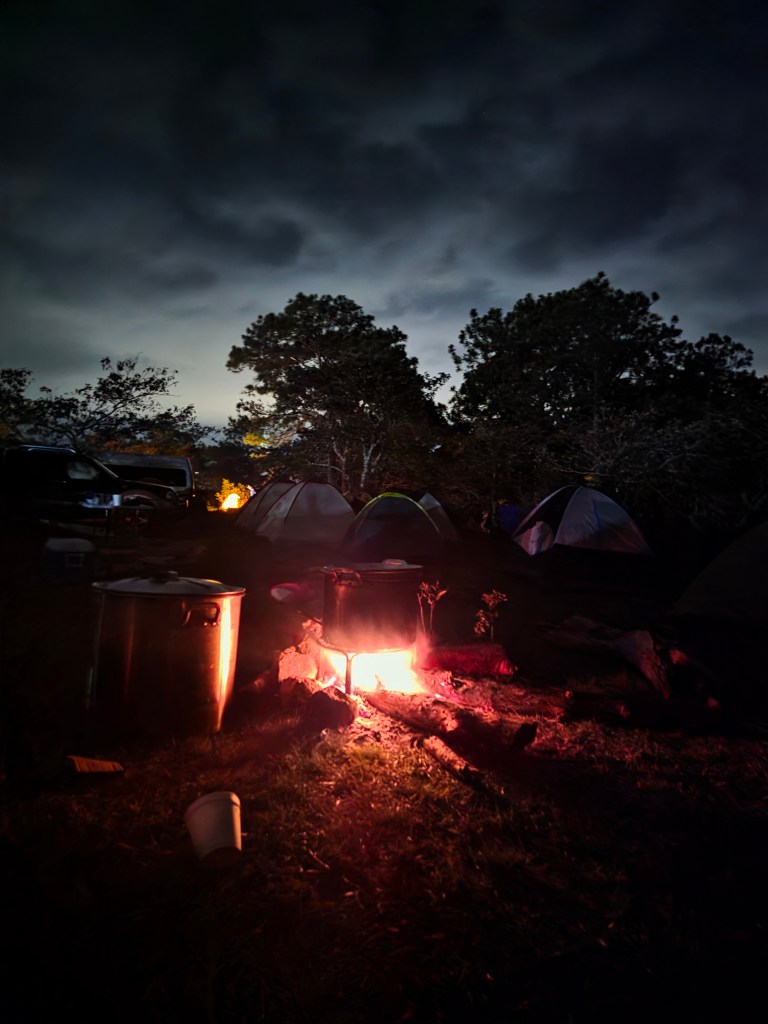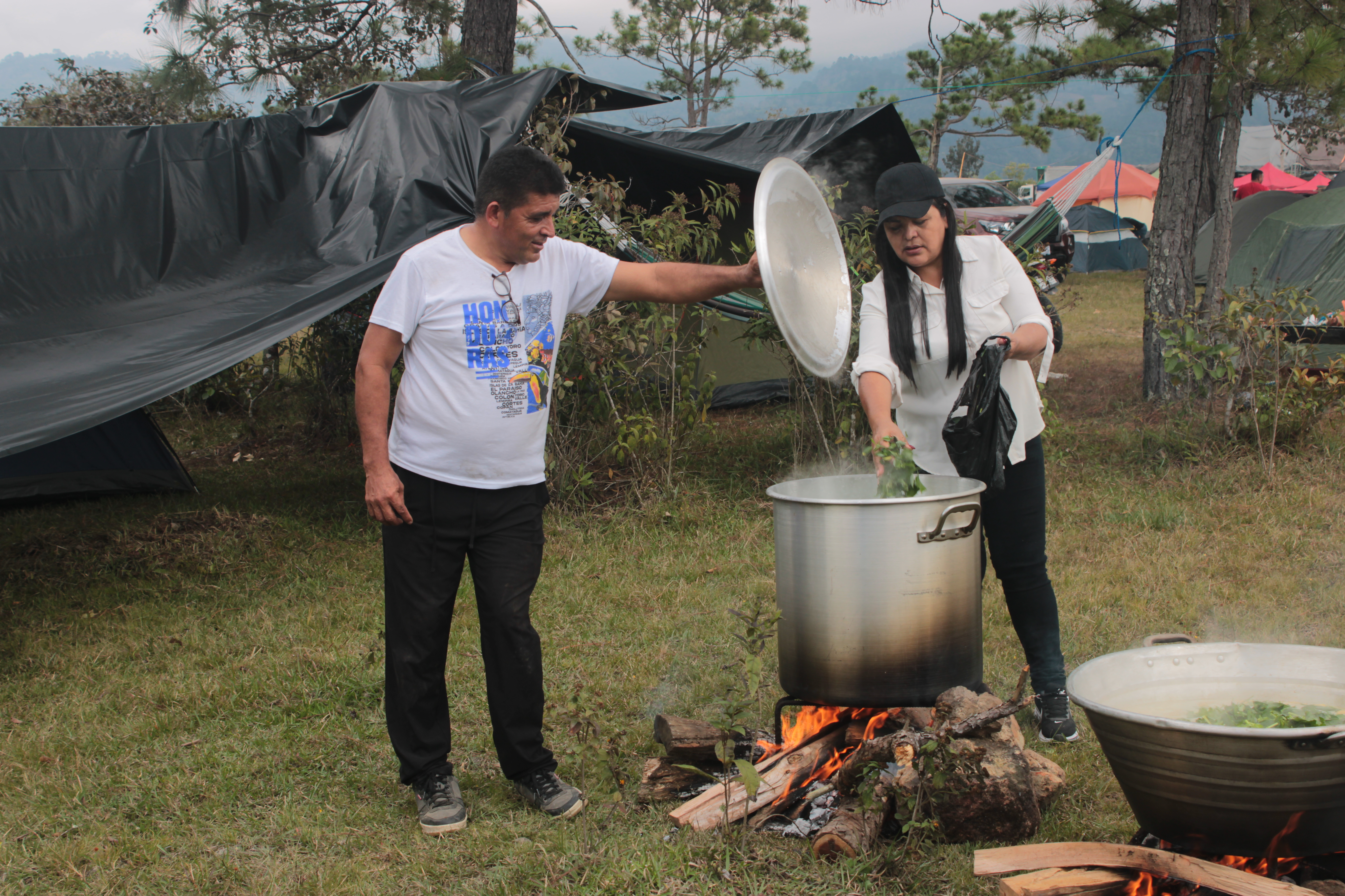 Groups from communities traveling together divide up tasks to cook and make sure everyone eats during the trip.